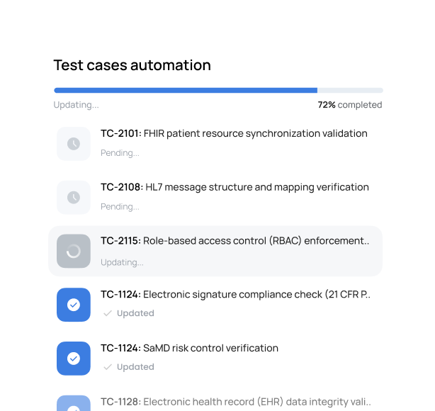 Test automation applied deliberately across the full healthcare product lifecycle, with clear control points, validation discipline, and measurable risk reduction at each stage.